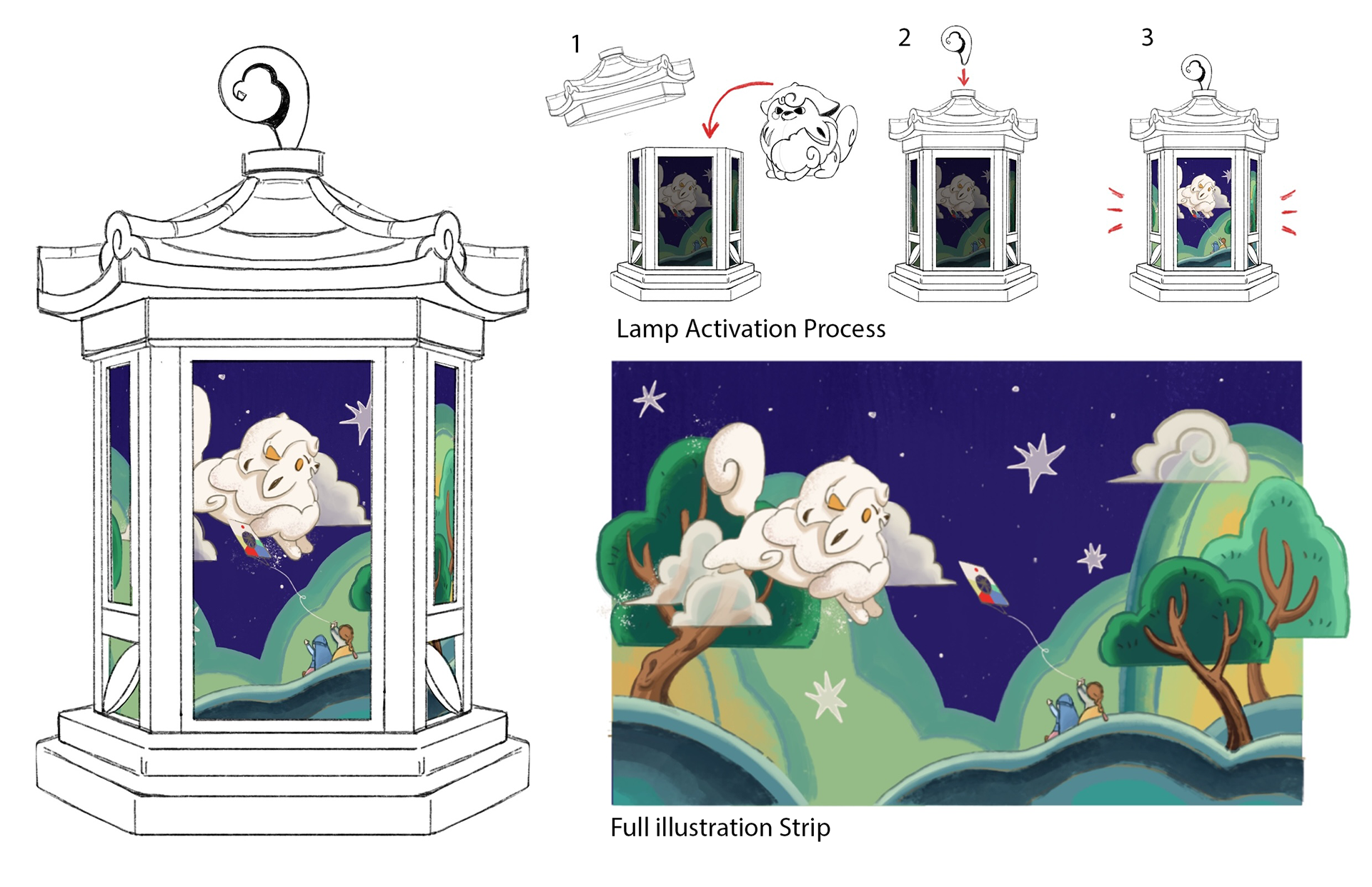The lamp display's scrolling animation layers are activated by the guardian friend's charm